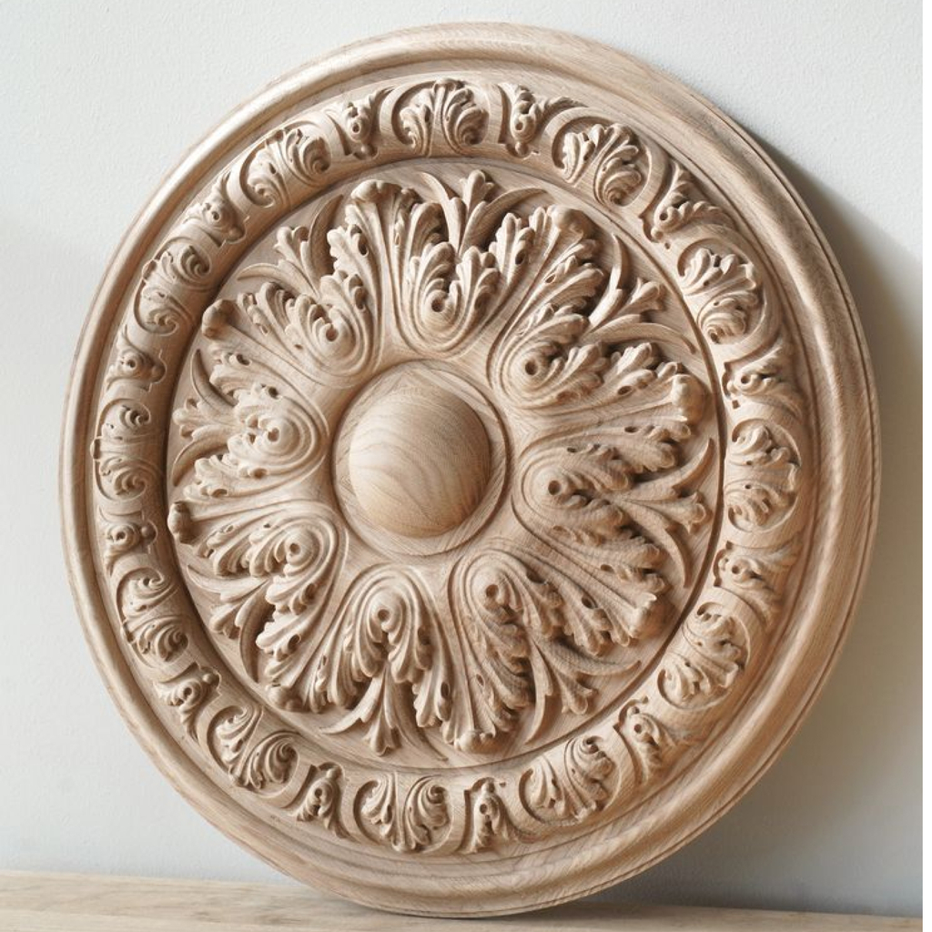 This ornamental rosette applique features an exquisite design with finely detailed acanthus leaves. The intricate carving brings a sense of sophistication. Whether adorning walls, mantels, or doorways, this rosette serves as a striking decorative accent, infusing your interior with classical elegance reminiscent of ancient architectural motifs.