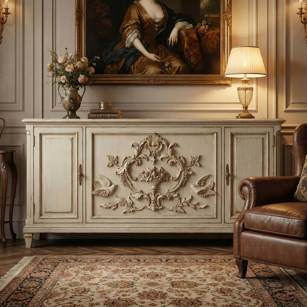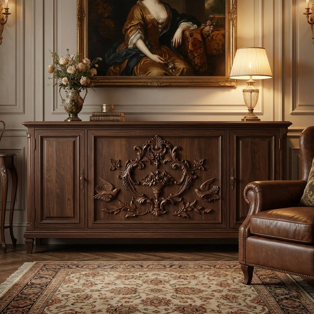 Indulge in the timeless elegance of these wood onlays, meticulously carved to depict a charming rose vase embraced by graceful doves. They exude an air of romance and sophistication, ideal for enhancing the beauty of furniture pieces or architectural features with their intricate detailing and graceful design.