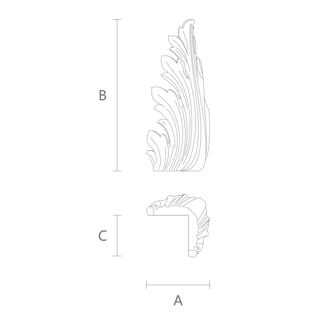 This decorative corner edge is presented in the form of an elongated acanthus leaf, a design choice that adds sophistication and charm to the product. This model can be used as a decorative element on doors, walls, cabinets, and in kitchens, dining rooms, living rooms, or other interior spaces.