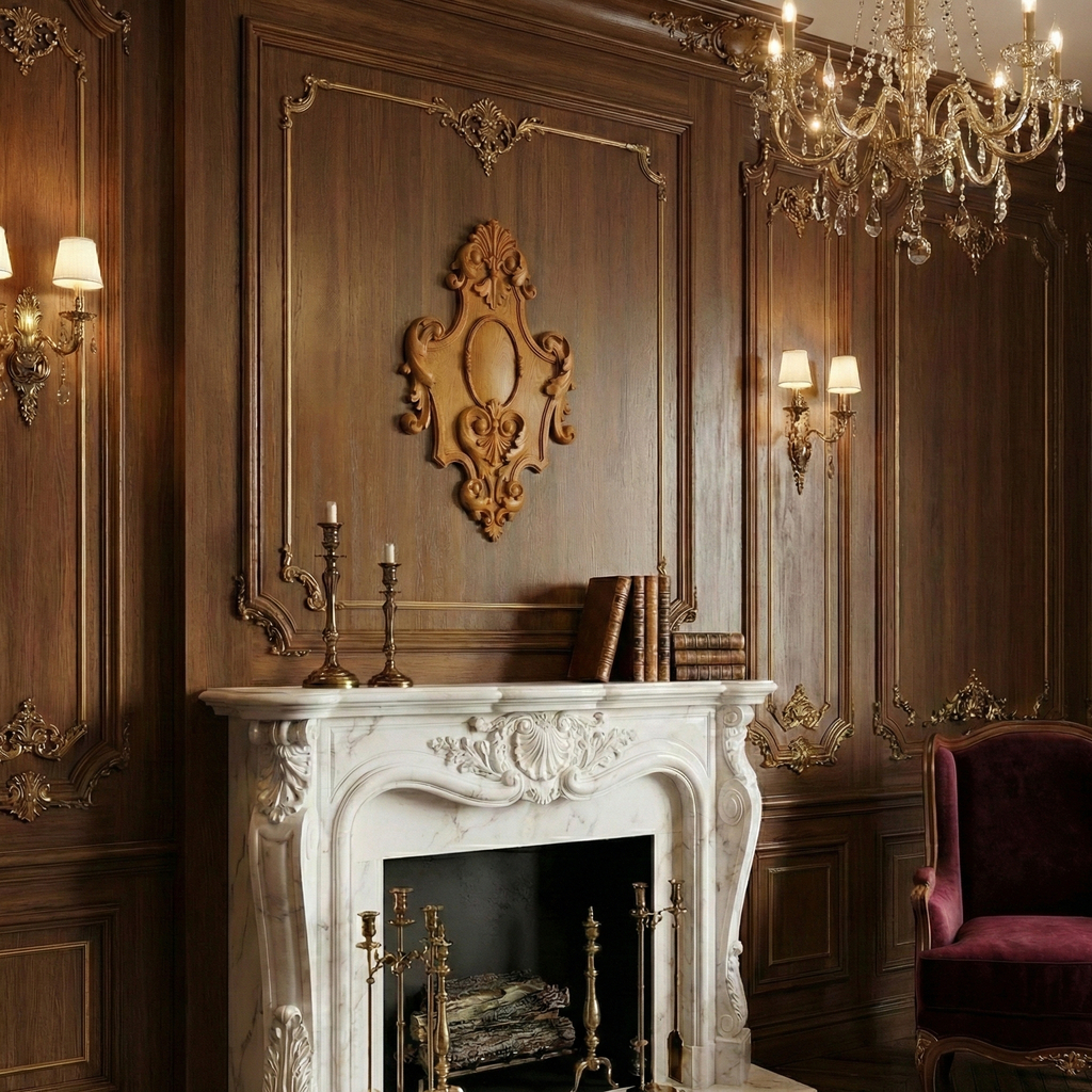 This elegant solid wood onlay is made in the premium style of inimitable Baroque. The product looks truly avant-garde and impressive. It has the form of a shield, decorated with delicate floral elements. The incredible design of the onlay gives it an atmosphere of pomposity and luxury. Such an exquisite decoration can be used on doors or walls of the kitchen, living rooms, bedrooms or decorate other interior objects.