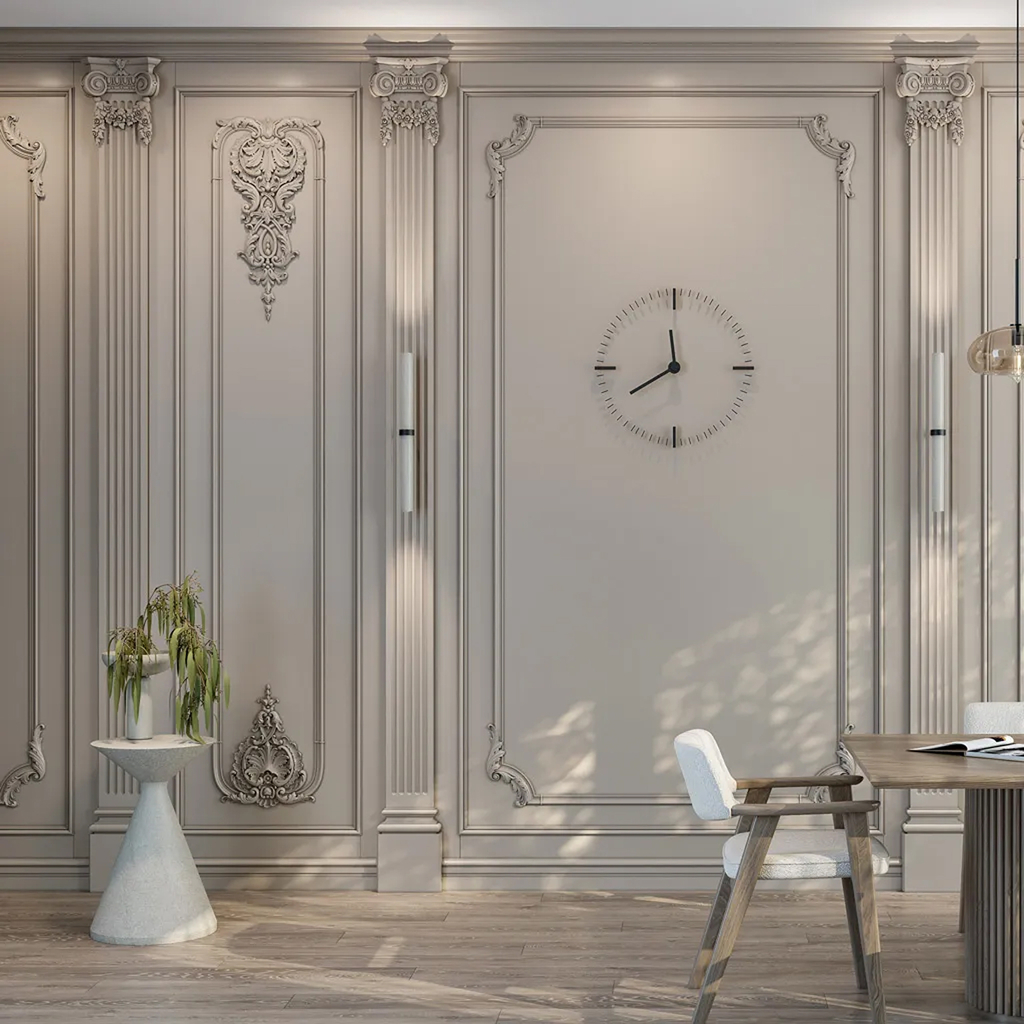 A distinctive feature of this capital for a fluted pilaster is the floral garland at the bottom, which enhances the capital's celebratory and luxurious appearance. The openwork base of the capital, adorned with classic volutes and ornamental patterns, imbues the product with elegance and historical allure. This model is ideal for decorating doors, portals, and various interior architectural elements like archways and window frames.