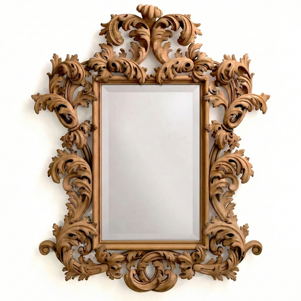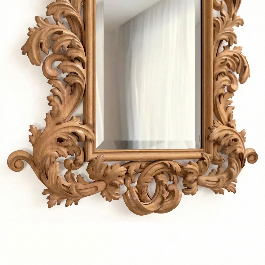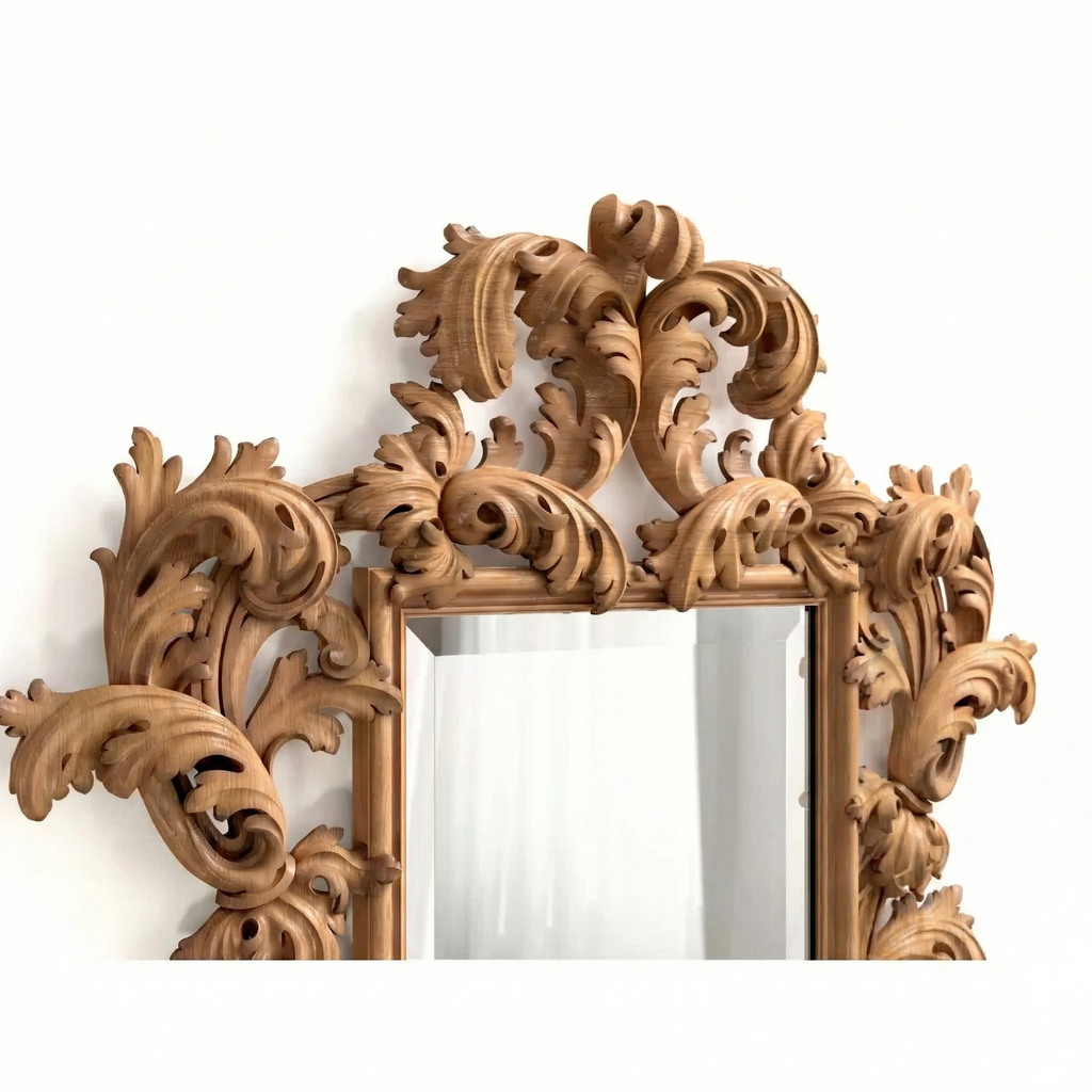 This gorgeous wooden frame is made in a premium Baroque style. It has a charming openwork design. Artfully made voluminous scrolls of leaves create a luxurious pompous composition that looks attractive and non-trivial. The product is designed for framing vintage mirrors used in living rooms, bedrooms, halls in status interiors. The lush floral ornament is professionally made by our qualified craftsmen. It will adequately decorate rooms with luxurious furniture or will become the dominant detail in laconic design rooms.