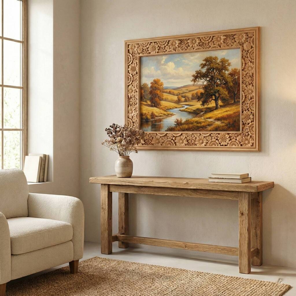 This wooden frame is made in the original Ethnic style. Its openwork massive shape looks laconic and impressive. It is decorated with a delightful carved composition in the form of ornate flowers of various shapes and sizes, which are organically sewn into a single image. The product is designed for paintings and mirrors, it is suitable for living rooms, bedrooms, dining rooms, halls. Our frames are made of beech and oak and processed manually by our qualified craftsmen. The result is a very smooth and soft surface without steps and chips that is completely ready for coloring.