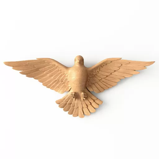 This ornate carved mascaron onlay in the form of a soaring dove is made of solid wood and carefully refined by hand. Such model can be used to decorate both ordinary interiors and church ones. A pigeon is considered a symbol of peace and tranquility, so the product can create a special atmosphere in your home. Thanks to professional processing and grinding, its surface turned out to be perfectly smooth for painting and varnishing.