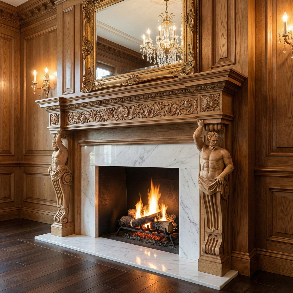 Skillfully carved from hardwood, this corbel depicts a majestic male figure, ideal for enhancing the grandeur of your architectural projects or furniture. Large enough to fit a luxurious room, it exudes strength and sophistication, infusing your space with classical elegance reminiscent of historical craftsmanship. Whether adorning a fireplace mantle or supporting a shelf, this corbel captivates with its imposing presence and timeless allure. Crafted to be positioned on the left side of your project.